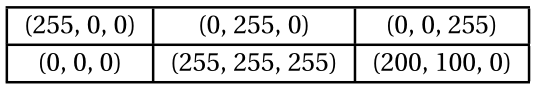 Par exemple, l'image ci-dessus de 3 x 2 pixels (et zoomée) se représente ainsi:
